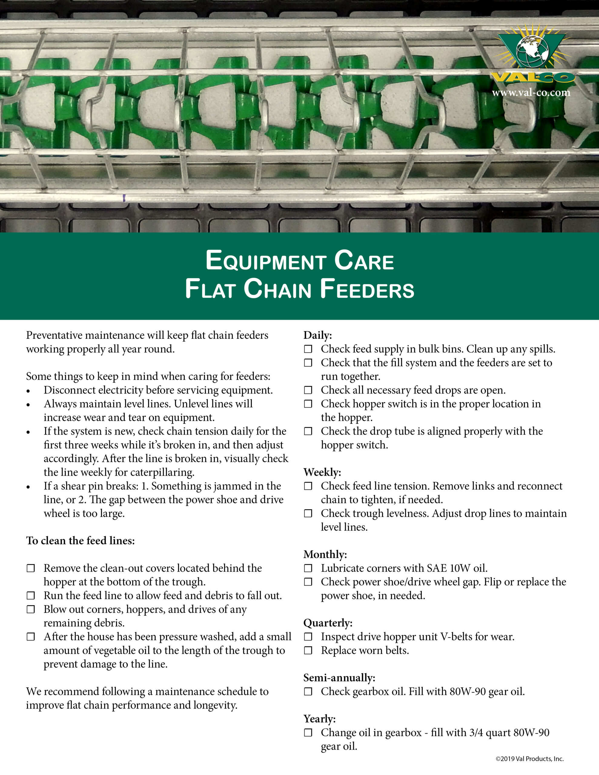 Always disconnect electricity before servicing equipment. Check chain tension regularly, especially when the system is new and being broken in, and adjust the tension accordingly. After about the first three weeks, check the line for caterpillaring every week. While examining the chain tension, also be sure to exam the trough levelness. Unlevel lines will create unnecessary wear and tear on the equipment. Use this checklist as a guideline to care for your flat chain feeders.