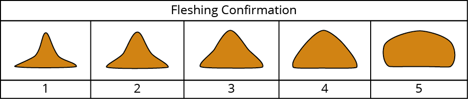 Fleshing is an indication of how much muscle is developed on the breast and wings. From this, fat deposits should increase gradually up to and during the onset of lay. To make sure that fleshing is on track, the birds should be handled at 12, 16, 19, and 21 weeks of age, then adjust feed as needed. Overweight birds should be kept consistently overweight at each mark (if 100g over at 16 weeks, should also be 100g over at 20 weeks), but underweight birds should be attended to so that they gain more weight.