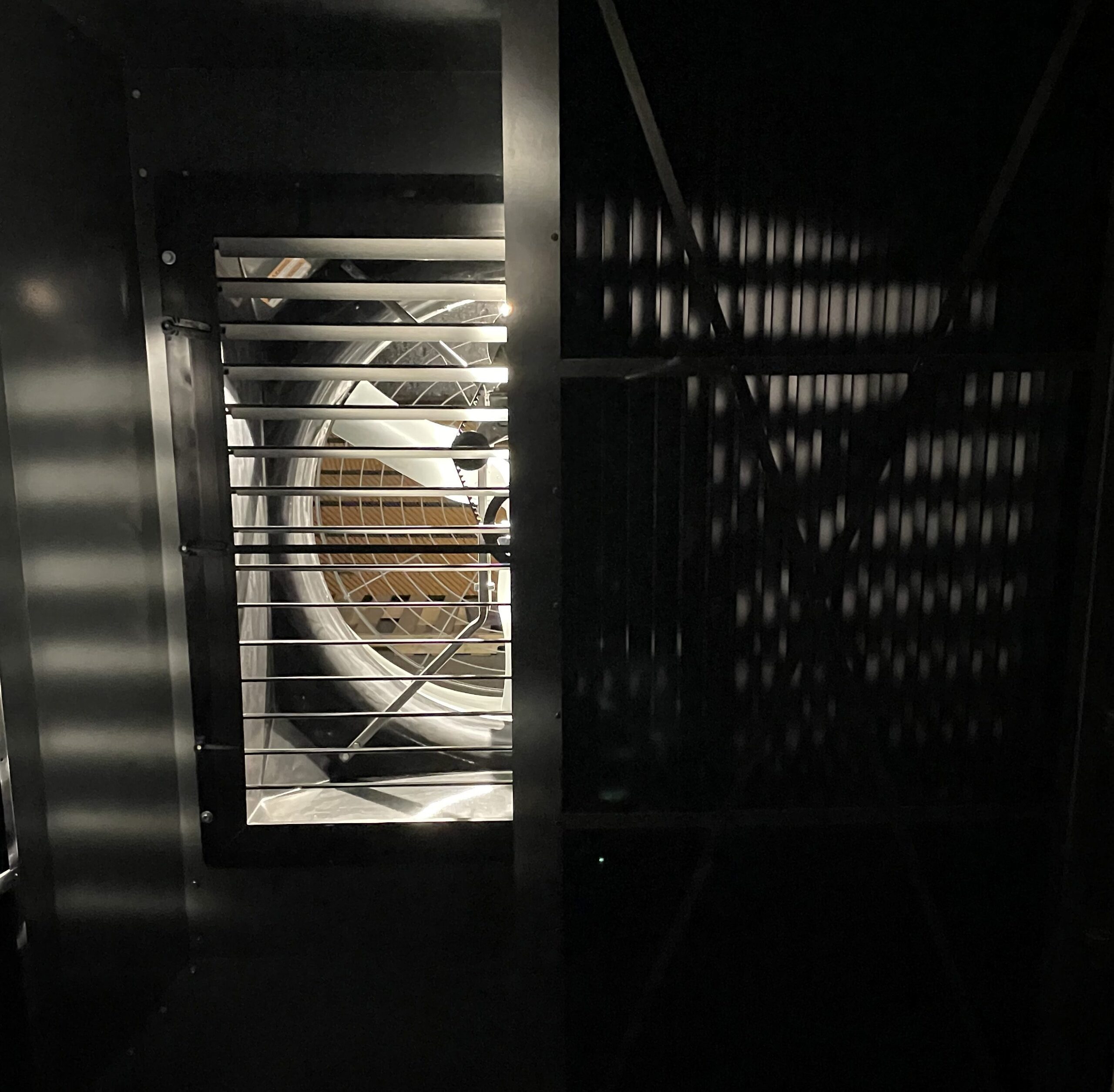 The Eclipse Flush Mount Light Trap significantly reduces light infiltration with minimal performance loss. The light reduction panels are on hinges so it is easy to swing them open to access the fan to clean the shutter, grease bearings, and check belt tension.