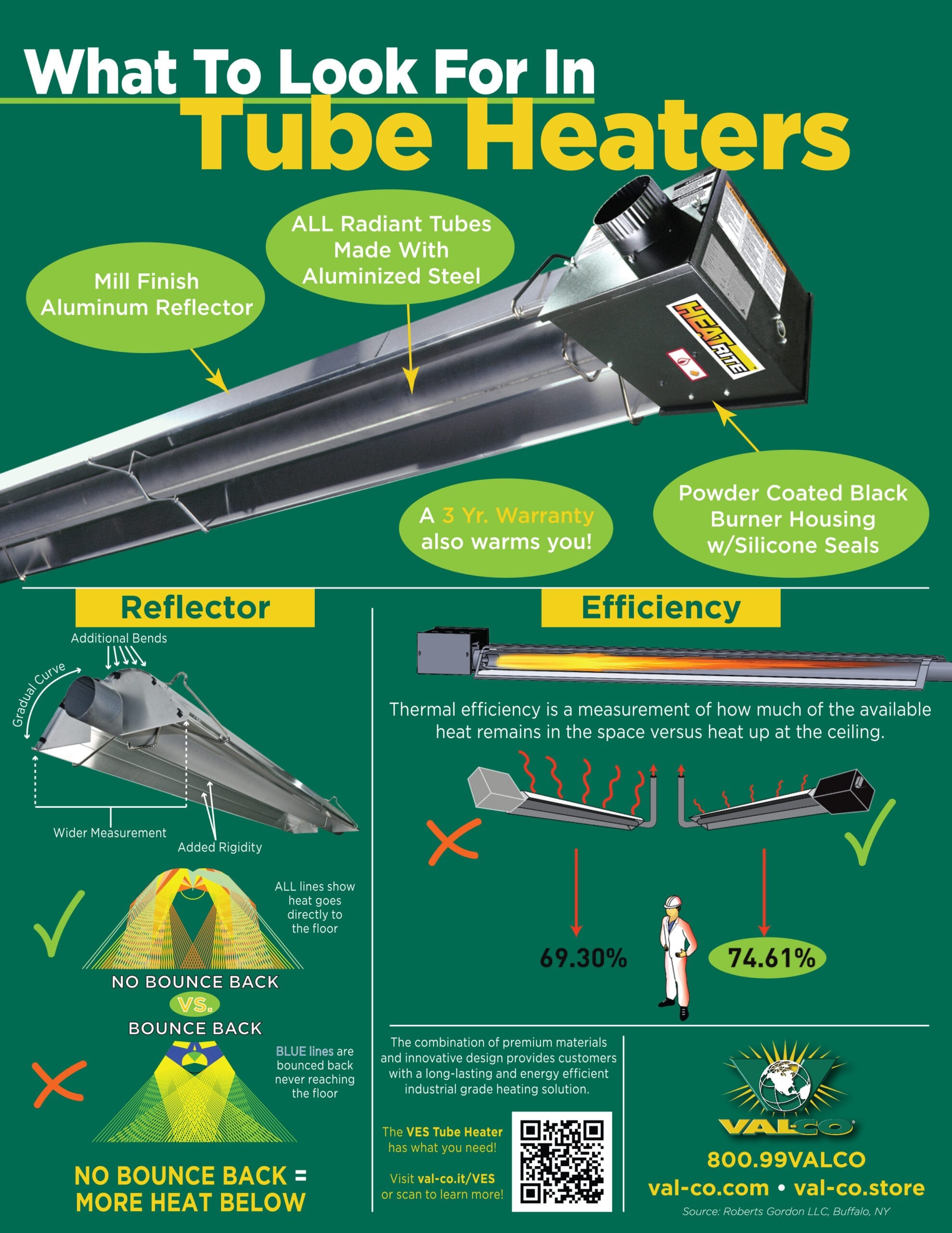 Tube heaters contain the flame in a box connected to a tube and a fan forces that heat through the tube which radiates to the litter. Because the combustion air can come from outside, tube heat usually require less maintenance. And because the flame is enclosed, there is usually less risk of fire.